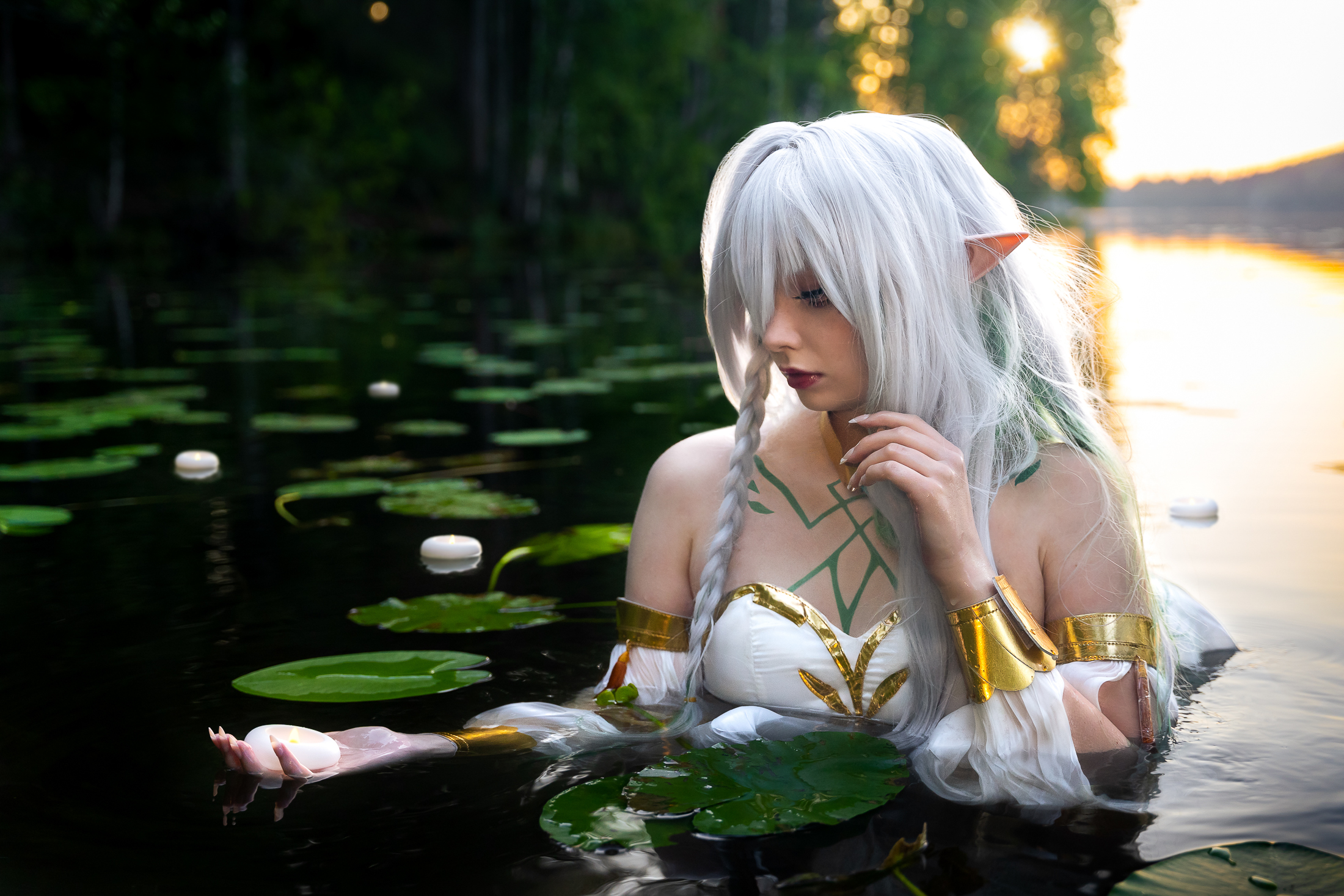 “Lähdimme haastamaan itseämme aivan erilaisella kuvauspaikalla. Kirkkaanvalkoinen mekko, järvimaiseman kauniit värit sekä lumpeiden joukossa hohtavat kynttilä luovat kuvaan herkän tunnelman. Editoinnissa olen pyrkinyt säilyttämään luonnollisen ilmeen.”