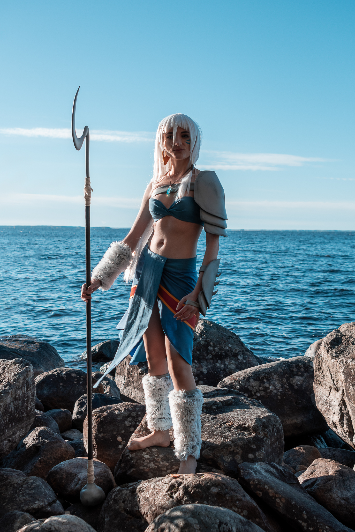 ”Halusimme vangita Kidan yhteyden veden elementtiin, joten kuvasimme rannalla, Atlantiksen henkeä mukaillen. Viileän sinivihreä värimaailma tukee sekä hahmoa että ympäristöä. Tämä kuva on yksi kuvaussession ensimmäisistä ja nousi heti sekä kuvaajan että mallin suosikiksi – luonnonvalo ja varjo luovat siihen dramatiikkaa ilman lavasteita, ja hahmonsa hyvin tunteva malli löysi oikeanlaisen ilmaisun intuitiivisesti. Kuvassa nouseekin esiin Kidan rauhallinen, mutta päättäväinen läsnäolo sekä Atlantiksen mystinen, ajan unohtama tunnelman.”