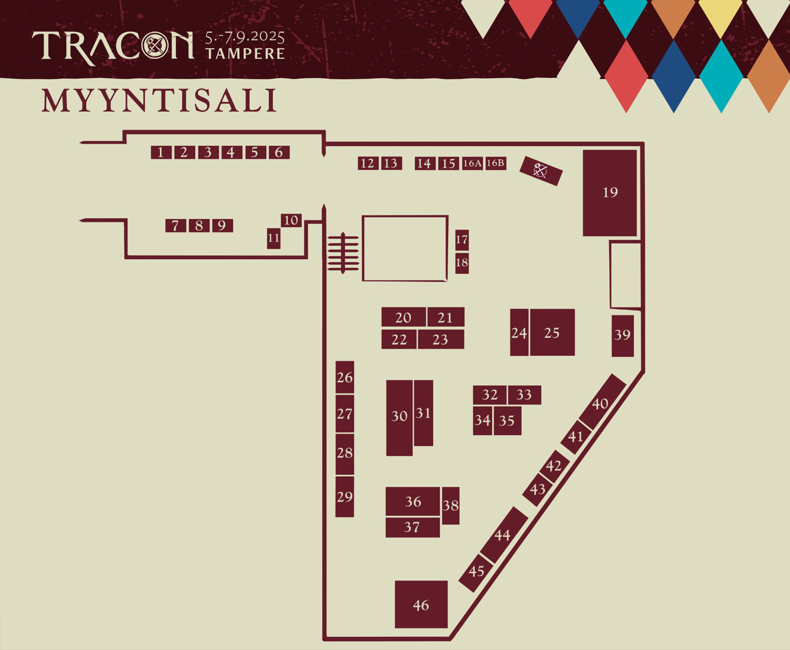 Traconin omalta myyntipöydältä voi ostaa muistoksi tapahtuman teemapaidan! Myynnissä on myös muuta Tracon-aiheista tavaraa, kuten vuosikohtaisia kangasmerkkejä. Traconin myyntipöytä sijaitsee myyntipöytäsalin etuosassa.