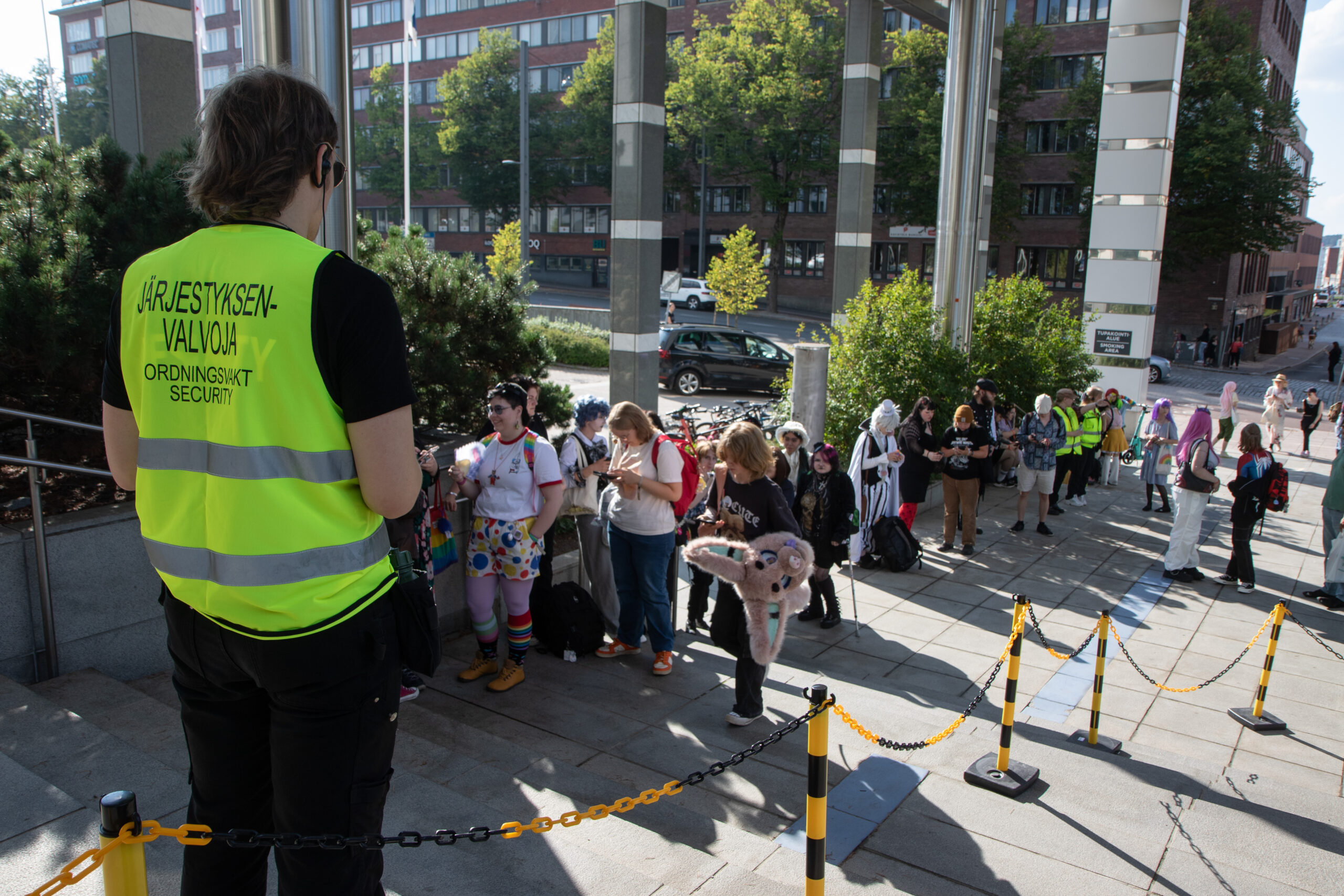 Järjestyksenvalvojat puuttuvat sääntöjen vastaiseen toimintaan. Jos havaitset jonkun aiheuttavan muille häiriötä tai vaaraa, ilmoitathan siitä heti lähimmälle järjestyksenvalvojalle! Tunnistat heidät kirkkaankeltaisesta tai -oranssista ”järjestyksenvalvoja”-liivistä.